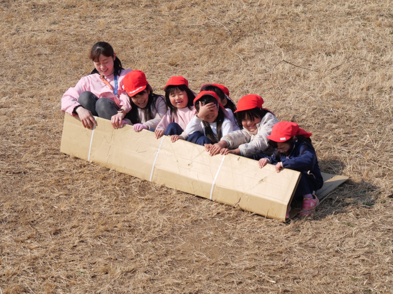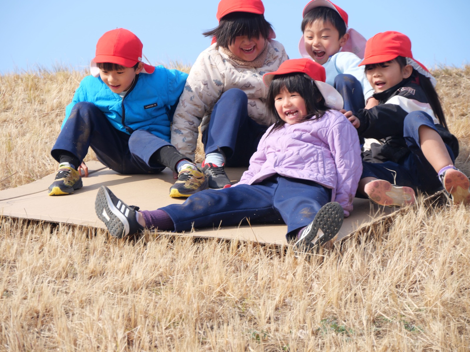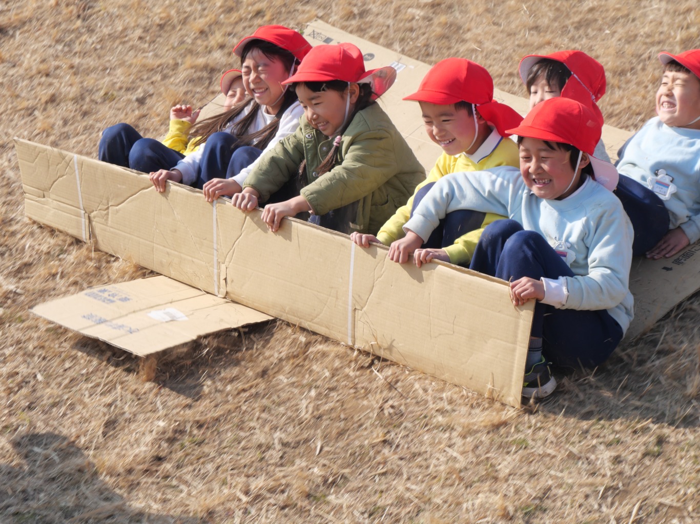 段ボールをおしりの下に敷き坂を滑るだけ。段ボール滑りはシンプルが故に子供を夢中にさせます。坂を滑る疾走感・自然の中で風を感じる開放感・止まるまでのスリルは、滑るたびに子供たちの好奇心を掻き立てます。滑り出しの方向・体重の乗せ方など、自分の乗り方によって「滑り」に変化があらわれます。よく滑るためのコツをお友だちと相談しながら工夫し、そして、滑り終えたら、また直ぐに滑りたくて坂道をダッシュで上り、また滑り降りてくるという繰り返しは、自然と心肺機能と筋力の強化につながります。