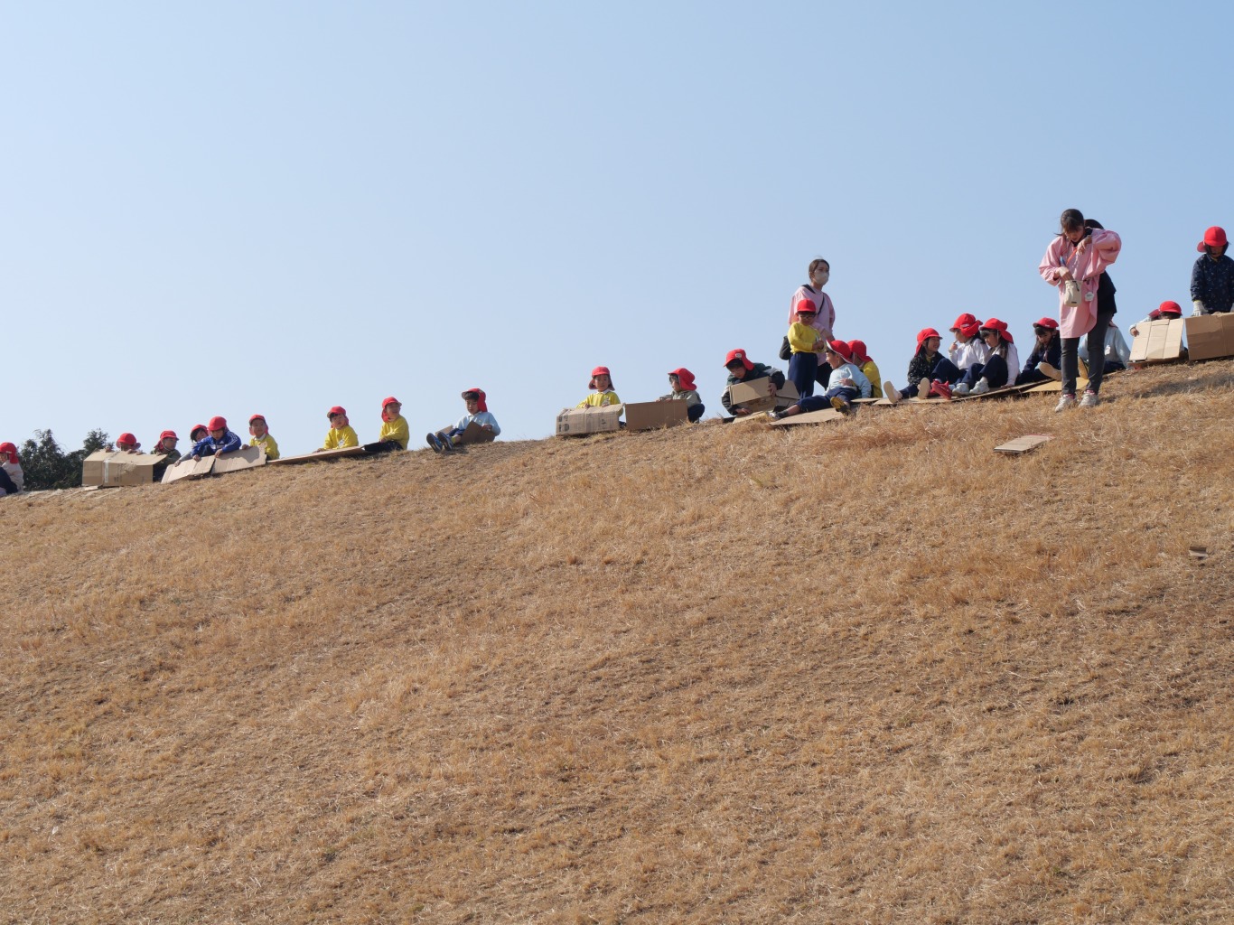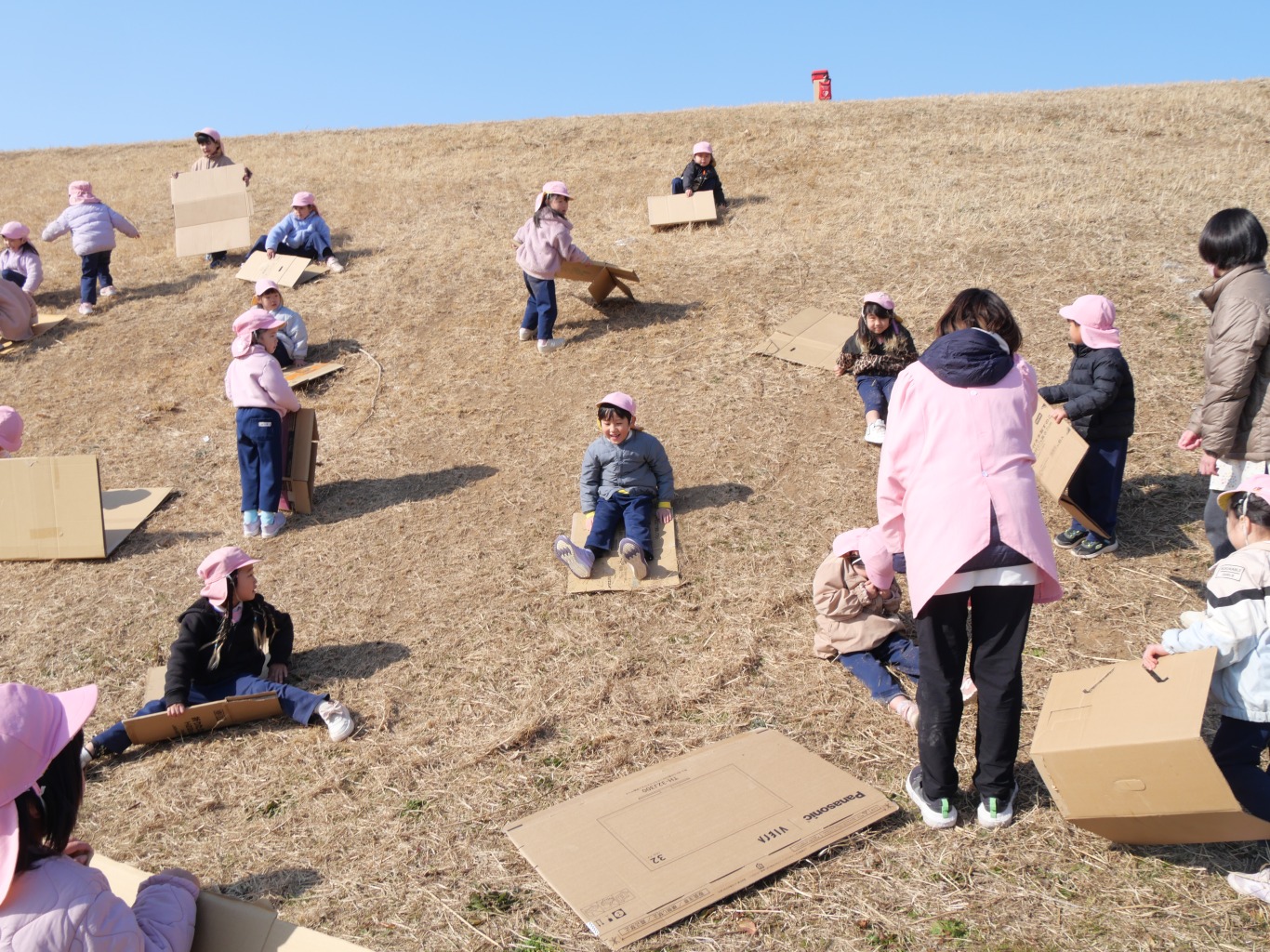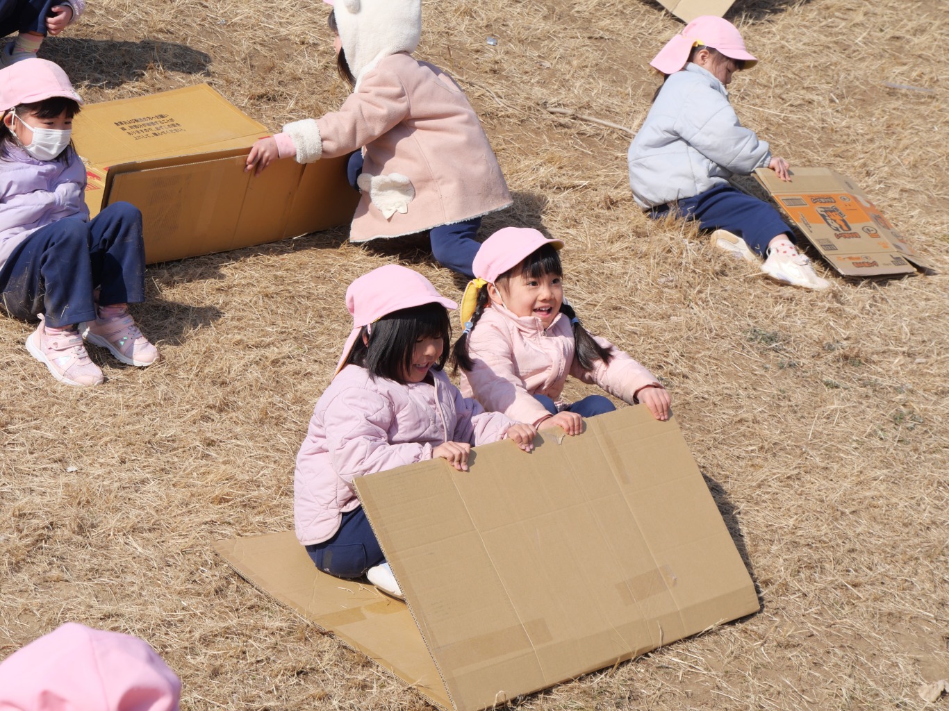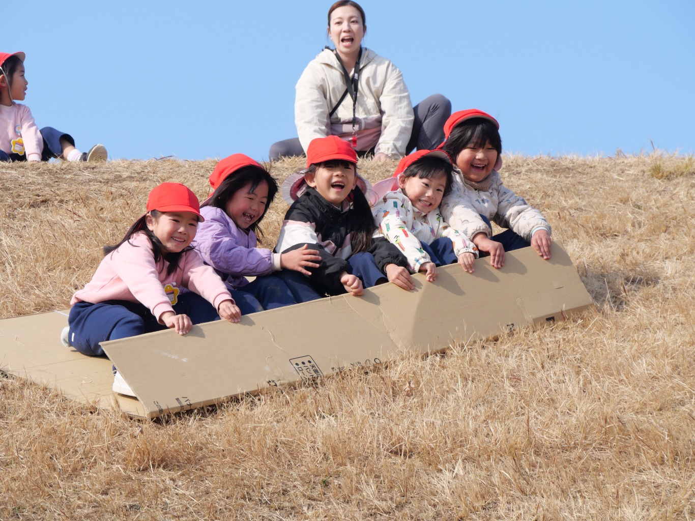 段ボールをおしりの下に敷き坂を滑るだけ。段ボール滑りはシンプルが故に子供を夢中にさせます。坂を滑る疾走感・自然の中で風を感じる開放感・止まるまでのスリルは、滑るたびに子供たちの好奇心を掻き立てます。滑り出しの方向・体重の乗せ方など、自分の乗り方によって「滑り」に変化があらわれます。よく滑るためのコツをお友だちと相談しながら工夫し、そして、滑り終えたら、また直ぐに滑りたくて坂道をダッシュで上り、また滑り降りてくるという繰り返しは、自然と心肺機能と筋力の強化につながります。